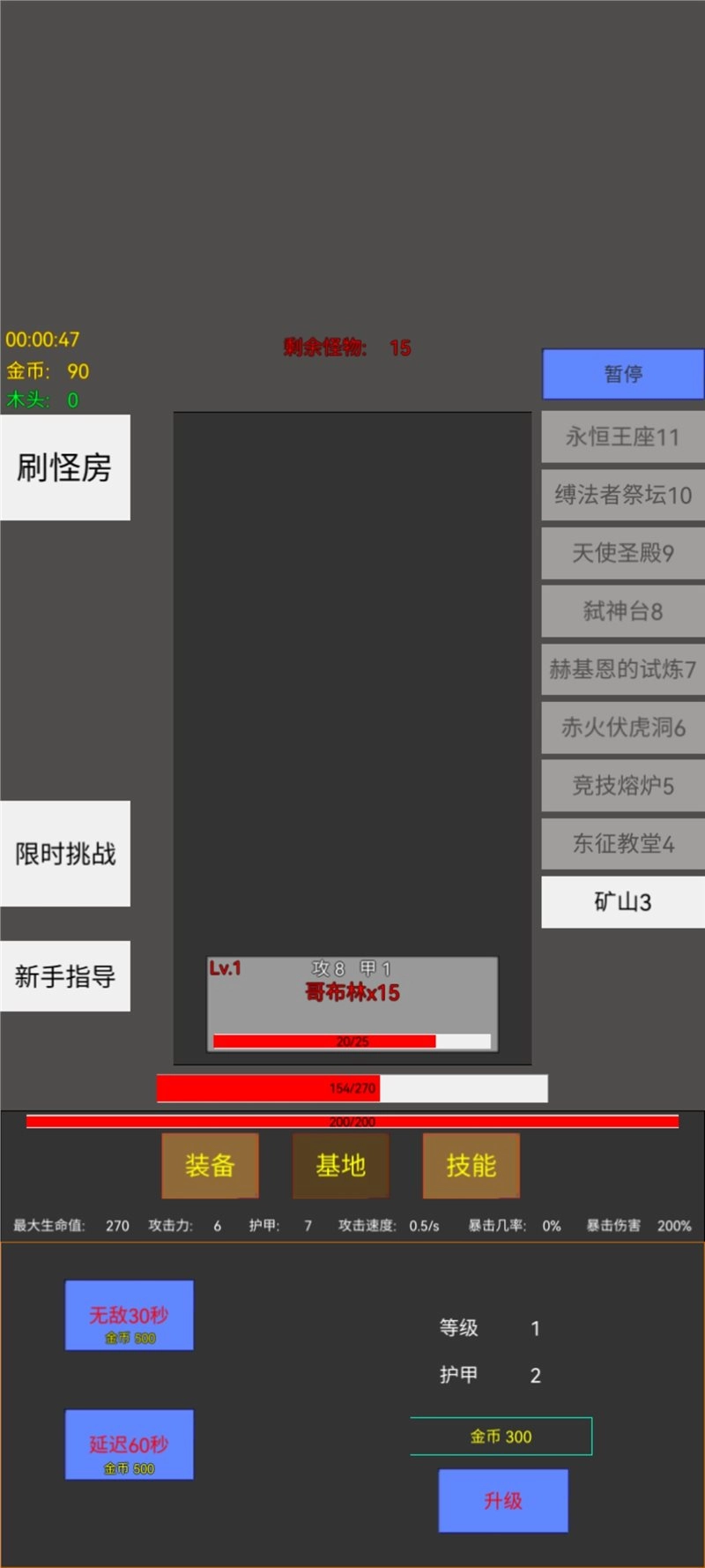 一款简易的守家类游戏,着重技能组合运用,通过刷boss来升级装备。设有限时挑战环节,需在此期间灵活调整技能,成功抵御45波怪物对基地的进攻!