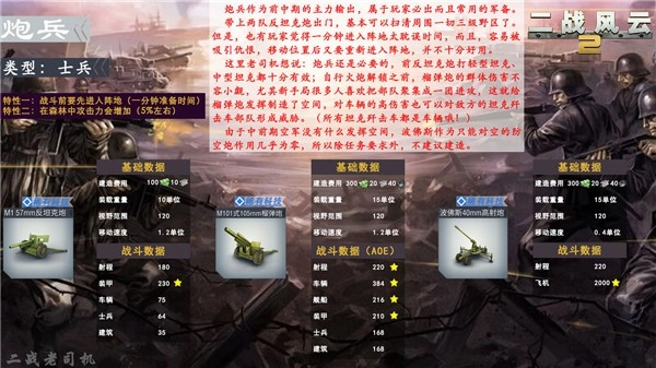 2、炮兵与步兵类似,防御力都极其薄弱,其中反坦克炮的防御值为0,另外两种炮兵的防御值也仅有50 。一旦被敌方突袭后排,就别指望能逃脱了,只能硬着头皮战斗到最后!