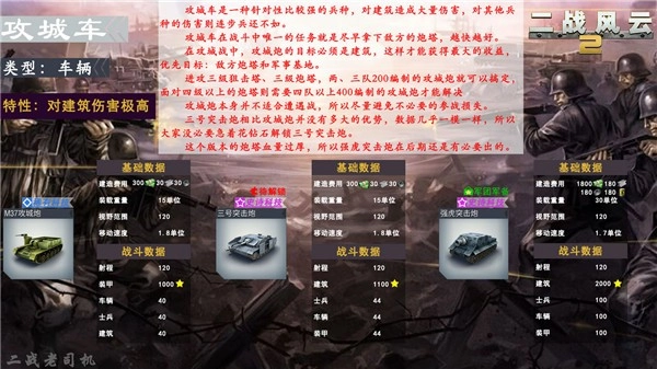 2. 攻城战涉及的作战单位包括:坦克、攻城车、炮兵(炮车)、歼击车以及步兵。