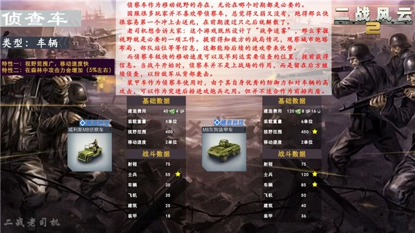 1、侦察车在前期发挥着至关重要的作用,无论是开拓视野、打击步兵,还是攻击建筑,几乎无所不能,除了无法占领建筑外,各项任务它都能承担,堪称货真价实的“劳工”。不过,这种情况一直持续到轻坦出现。