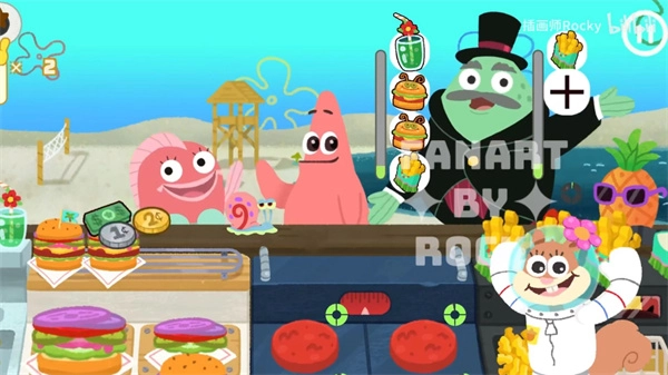 在这款游戏里,依据动漫角色各自的特性,设计了对应的游戏机制。就像派大星,有时会出现忘记结账的情况,而有时又会给玩家带来意想不到的财富;蟹老板呢,说不定什么时候就提前把我们的金币偷走;至于珊迪,她能够助力我们对厨房道具进行升级。