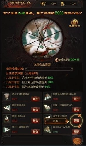 玩家完成限时任务后,能激活带有伤害提升效果的套装,以此增强自身战斗力;与此同时,还可以借助挂机的方式获取大量资源以及稀有材料。