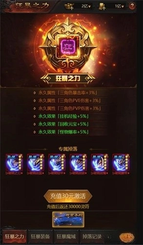 小资玩家可以优先激活狂暴之力,花费30元充值就能永久提升角色属性,还能解锁狂暴魔域,获取高性价比的游戏体验。