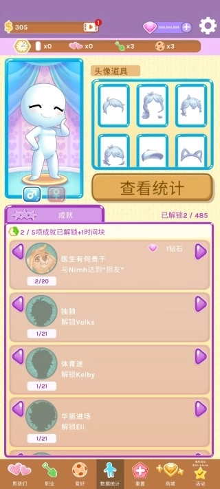 3、要定期去看看成就面板,优先把那些容易完成的成就搞定,这样就能拿到钻石和道具了。拿到道具后可以用它们来提高互动的效率,让亲密关系升级的速度更快一些。