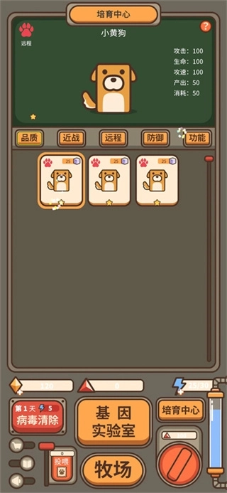 2:点击“培育中心”,能够查看小黄狗等动物的攻击、生命、攻速等属性,还可以开展动物培育的相关操作,以此来提升动物的品质。