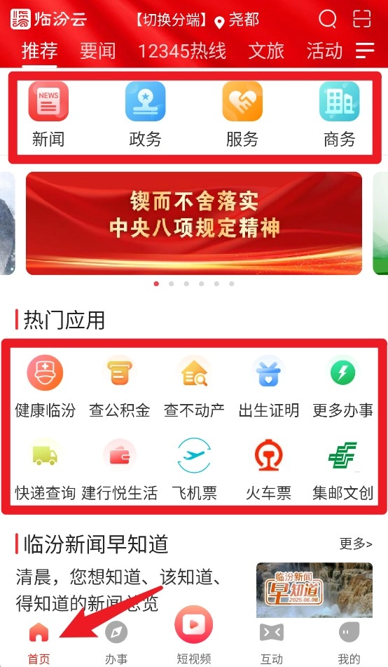 1、首页整合新闻、政务、服务、商务等栏目,并提供健康查询、票务等热门应用。