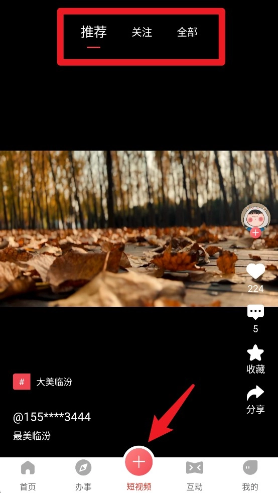 3、短视频页展示本地生活类内容,可切换推荐、关注及全部视频分类观看。