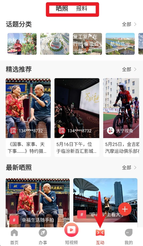 4、互动页面支持晒照与报料功能,涵盖本地热点话题与精选活动推荐内容。