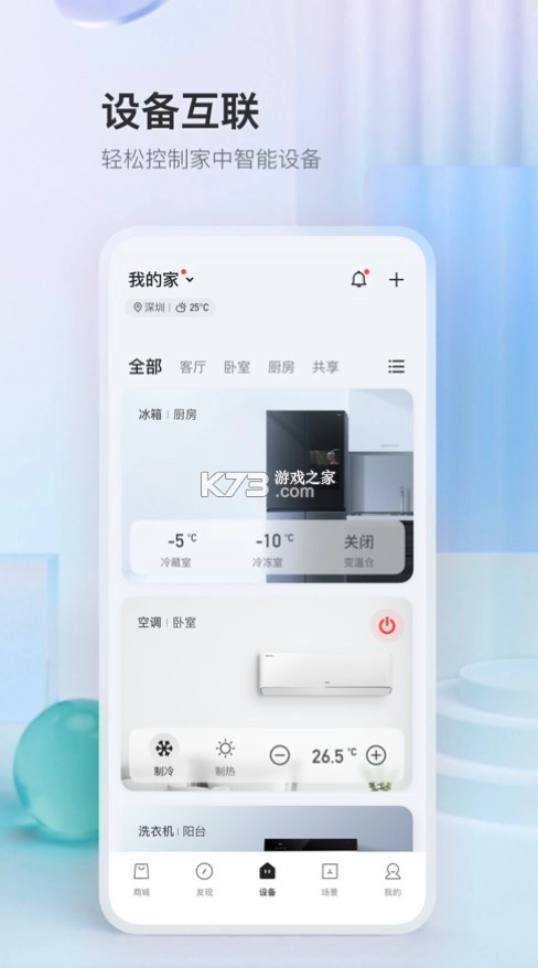 5G时代,开启全新家庭智能生活体验,让您切实畅享科技魅力。多屏互动、娱乐中心、设备操控,皆能一手掌控。在设备页面,为您提供虚拟体验,实现智能家电的在线管理,支持家电功能控制、状态查询等在线操作。