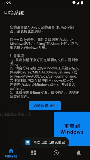 1、在进行系统切换操作时,在重启进入Windows系统之前,请务必妥善保存正在编辑的文件,不然文件将会丢失。