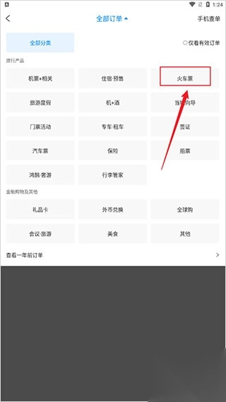 4、接下来,在下拉菜单里能够查看全部相关订单,我们选取【火车票】选项。