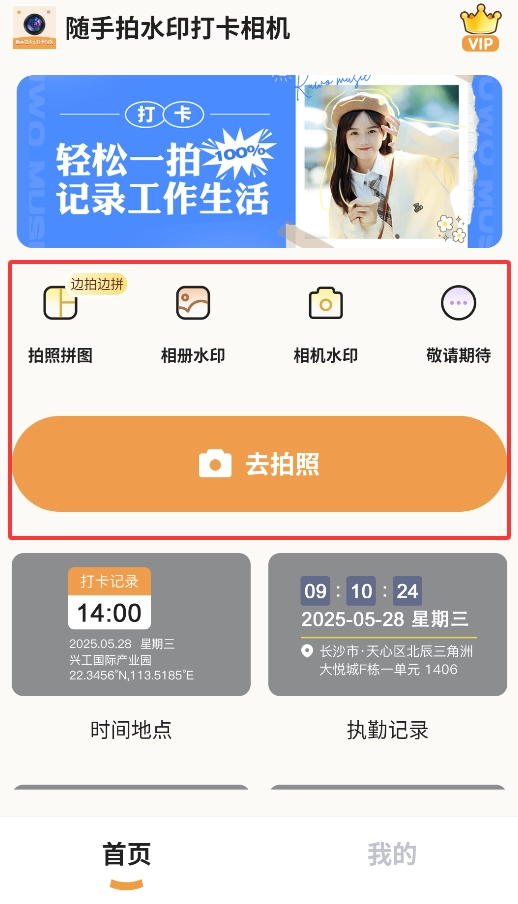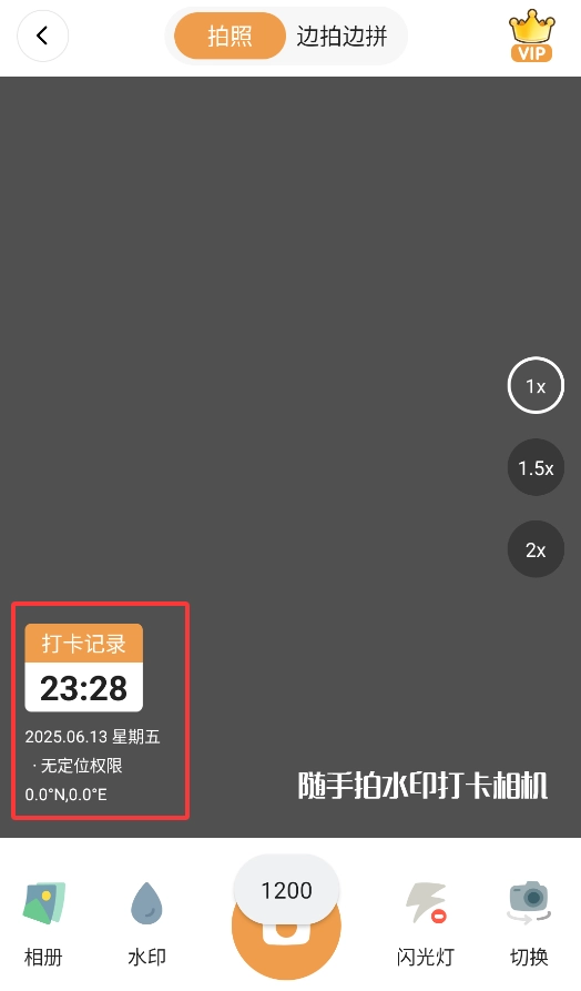 2、拍摄过程中,系统会自动添加上带有时间、地点信息的打卡水印,该水印呈现在照片的左下角。