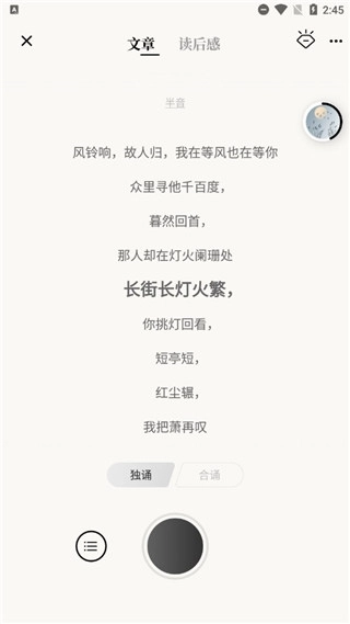 不仅如此,软件还设有诗词朗诵功能。用户开启录音功能后,便可录制自己的诗词朗诵音频,通过精准把握诗词所蕴含的情感,巧妙控制朗诵节奏,以这种方式进一步加深对诗词的理解与记忆,深度体会作者创作时的心境。