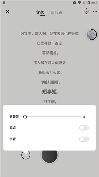 4、在页面下方正中间,点击那个大大的按钮,就能开启朗诵。而点击左边的三条横线图标,可对背景音、耳返以及拼音进行调节。
