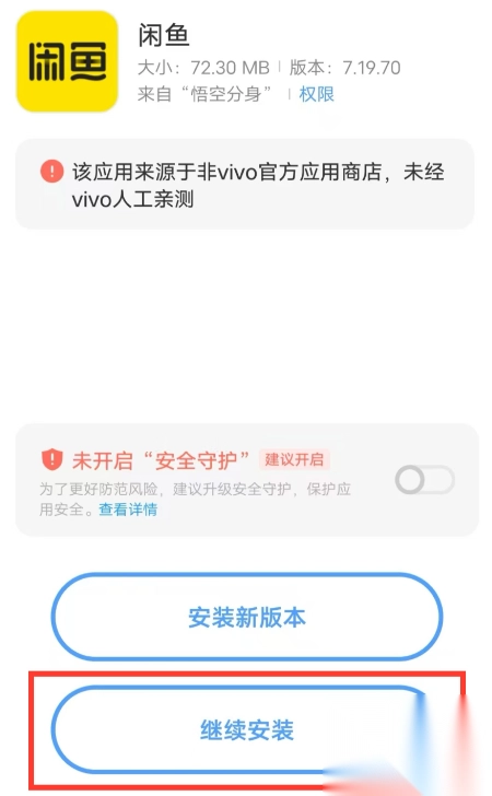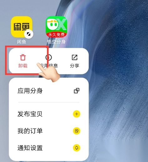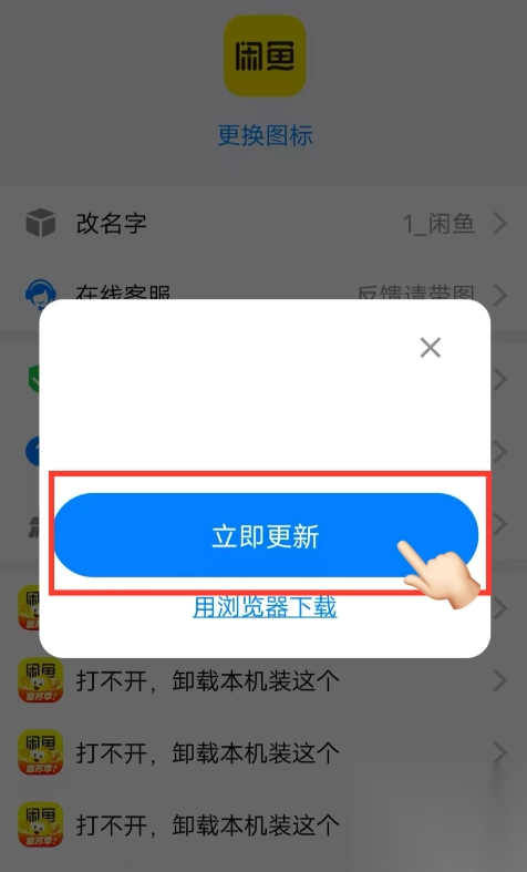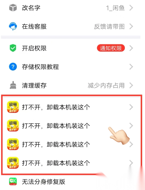 2、在悟空分身首页,点击闲鱼图标,进入详情页面后,点击“打不开,卸载本机装这个”。