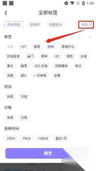 3、例如选择【青春】题材的小说,点击右方筛选还可添加如【1v1】、【甜宠】或【轻松】等更多的标签以更准确地定位。
