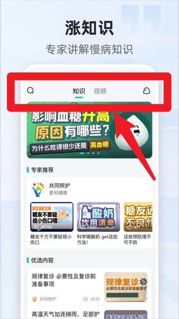 3、在“涨知识”板块,会有专家对慢病知识进行讲解,用户能够浏览相关的图文以及视频内容,从而实现科学的健康管理。