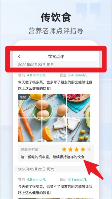 4、“传饮食”功能,是由营养师对每日饮食记录进行点评,助力用户知晓餐后血糖所受影响,进而优化饮食结构。