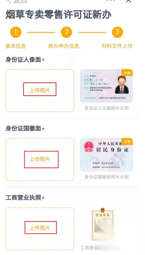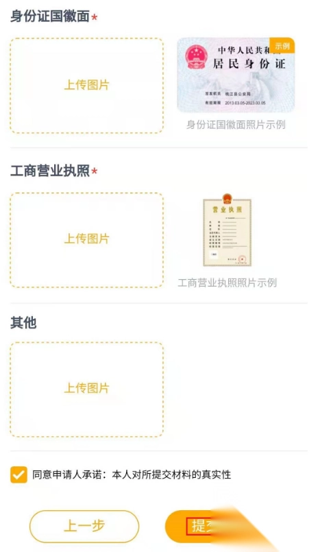 3、根据申请提示输入相关信息,并在上传所需要身份证正面和反面以及营业执照,(注意:拍照上传的图片必须清晰全面,不能只拍一部分),上传完所需图片后点击下方“提交申请”即可完成相关事项的申请事项。