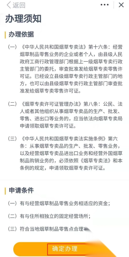 2、点击所需办理的事项,点击手机下方“确定办理”,输入烟草专卖零售许可证号然后点击“下一步”。