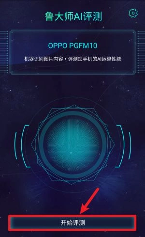 1、启动页面显示当前手机型号,点击“开始评测”按钮即可测试AI性能。