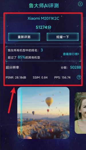 4、完成评测后,会展示综合评分以及PSNR、SSIM等超分辨率画质指标,同时支持排行榜查询功能。