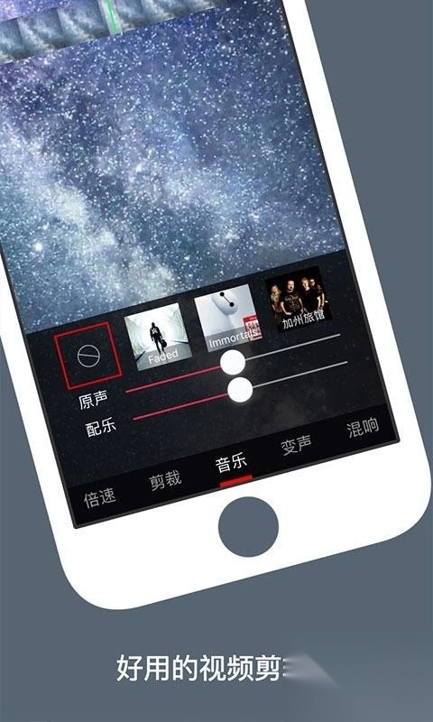 支持为视频添加各类背景音乐,并且能够自由设置原声与配乐的音量。