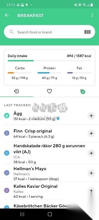 与昨天一样:当您想跟踪与以前相同的食物时,此部分很方便-您可以找到日记中列出的所有食物,并可以通过单击右侧的“+”进行跟踪
