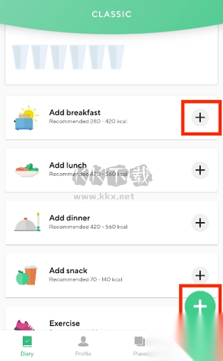 - 轻点“日记”右下角的“+”,接着挑选想要跟踪的膳食。