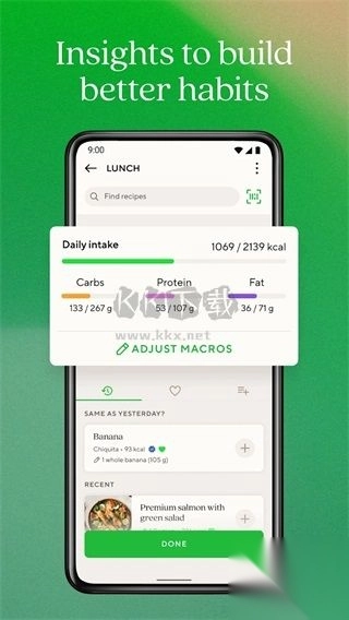 1、饮食记录: 允许用户记录每天的饮食和饮水情况,并提供了世界各地的食品数据库,用户可以快速添加他们所吃的食物。