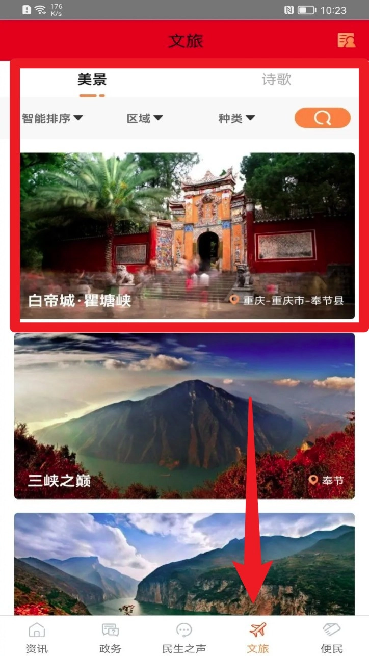 2. 切换至“文旅”栏目即可浏览本地景点推荐、美图视频与旅游资讯内容。