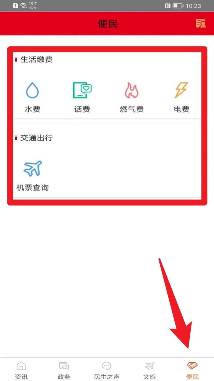 3. 轻点“便民”页面,就能执行水电燃气缴费、话费充值以及机票查询等各类生活服务操作。