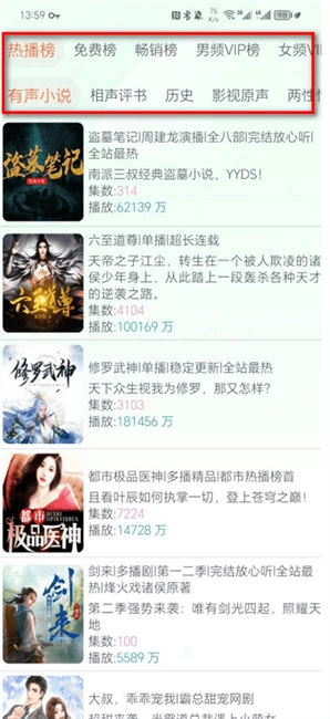 3、在听书排行榜可以看到各种有声小说,历史等内容。