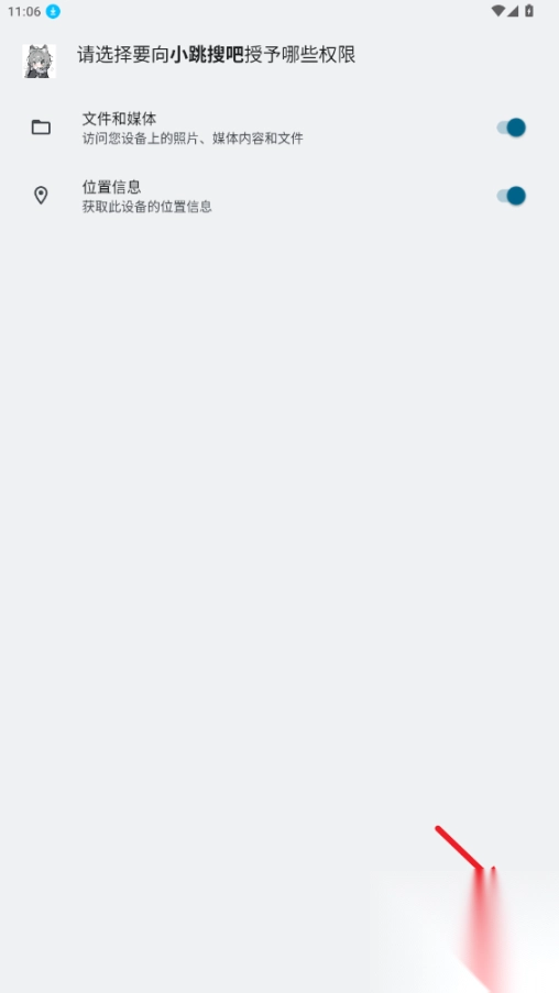 打开小跳搜吧app,点击“继续”,开启相关权限。