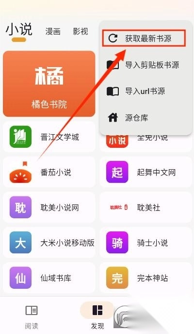 2、在发现页面,点击右上角的三个点,此时会弹出一个窗口,接着点击窗口中的“获取最新书源”,就能够畅快地观看啦。另外,如果您手头有书源以及源仓库,也可以按照自身需求进行添加,这样便能轻松扩充更多可观看的内容。