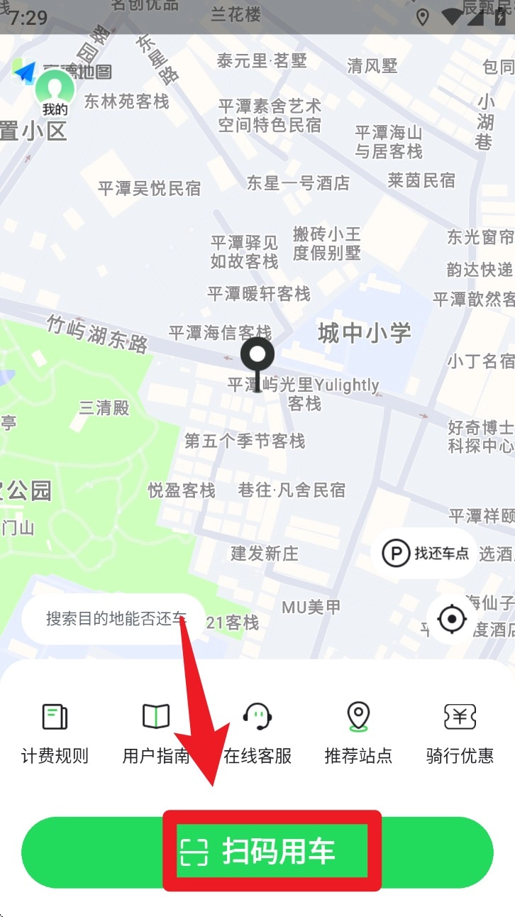 1. 开启App来到首页,轻点底部绿色的「扫码用车」按钮,扫描周边车辆的二维码,就能直接开启骑行,过程简便,没有繁杂步骤。