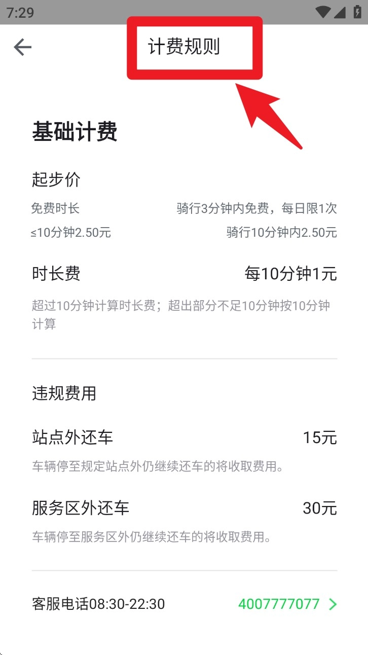 2. 如果您想知晓骑行费用,可点击底部菜单栏的「计费规则」,查看关于起步价、时长费以及违规还车说明等详细内容。