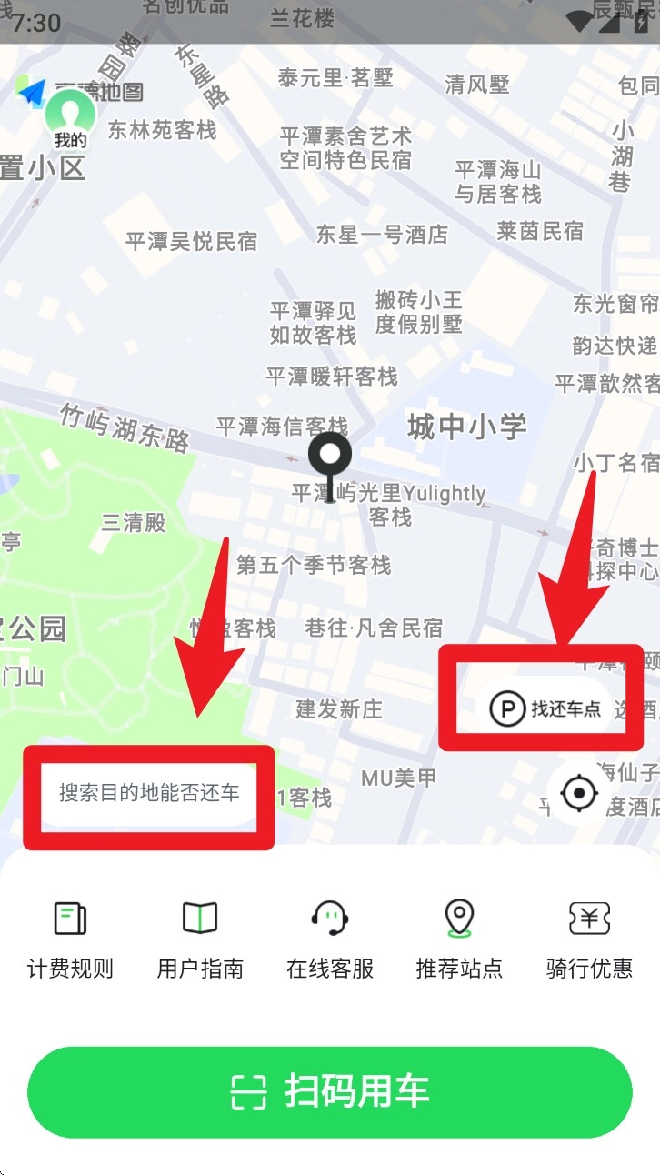 4. 在地图页,您能够使用「搜索目的地是否还车」以及「找还车点」这两个功能,借此提前知晓目的地是否支持还车,从而规避产生额外费用。