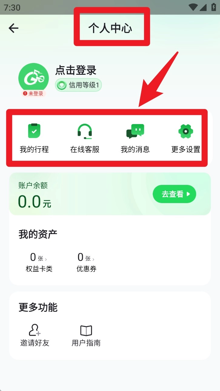 5. 轻点左上角的「我的」,进入个人中心,在此处能够查看行程记录、消息通知,找到联系客服的入口,还能看到账户余额与优惠信息。