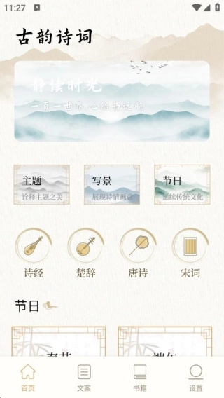 1. 软件下载完毕后,直接点击进入平台界面,首页提供古韵诗词内容,涵盖诗经、楚辞、唐诗、宋词等。
