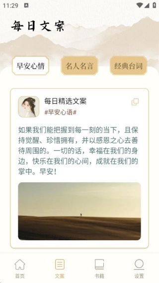 2、每日文案内容都是非常的全面,可以选择早安心情,名人名言,经典台词等文案进行使用欣赏。