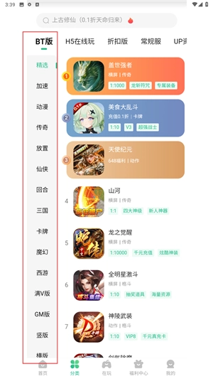 2、在【分类】【BT版】中,按游戏类型筛选游戏。