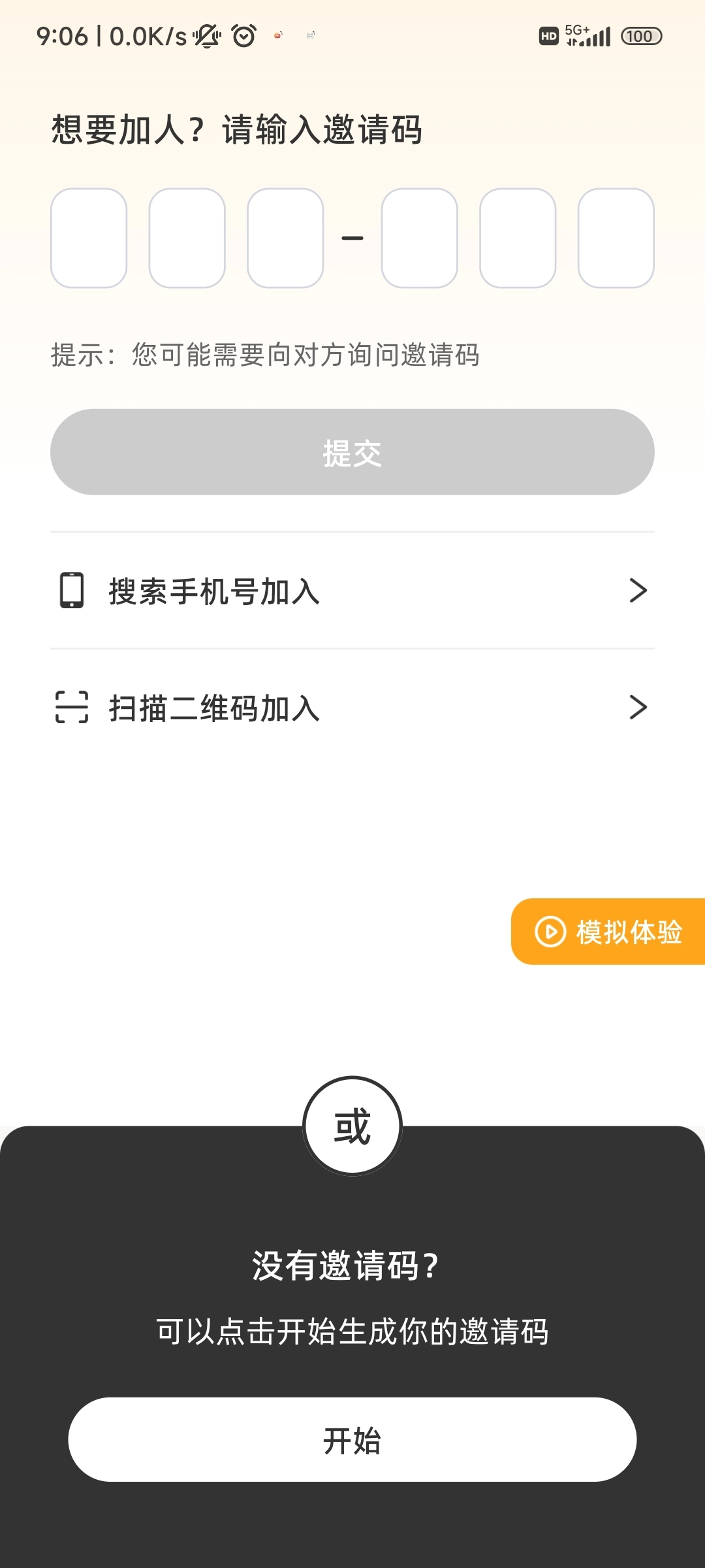 1、开启嘿在app,填入邀请码,或者借助手机号加入,又或者扫描二维码,随后点击【开始】