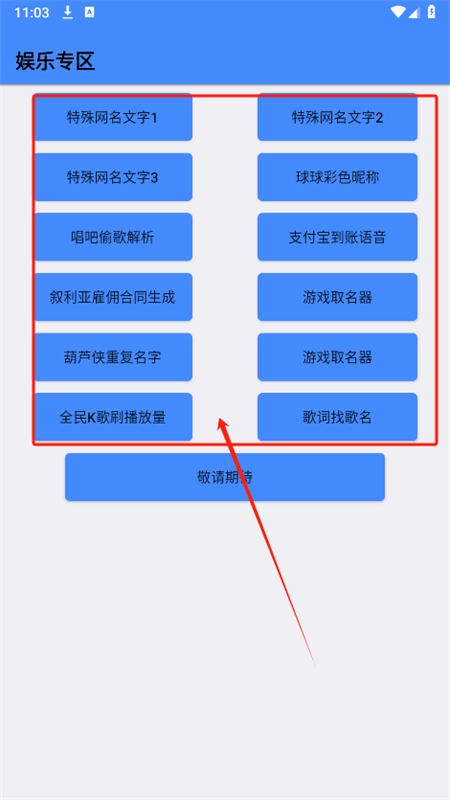 4、于娱乐专区页面,为各位准备了特殊网名文字、支付宝到账语音、游戏取名器等实用功能。