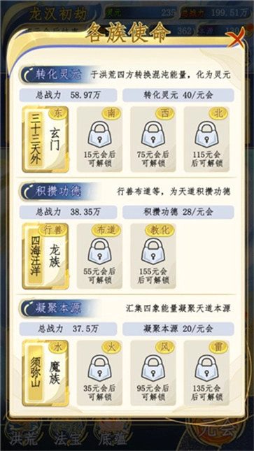 3、还可以抵御外族入侵,还有天道金榜等一系列可以提升战力的玩法,洪荒内部势力争斗可以让他们自由的去打,争夺资源啥的,保留强大的战力即可。