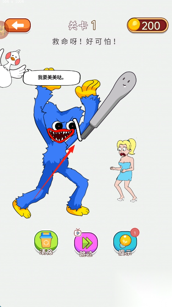 1、观察角色需求,如关卡1帮怪物处理美发问题,点击道具或区域完成互动。