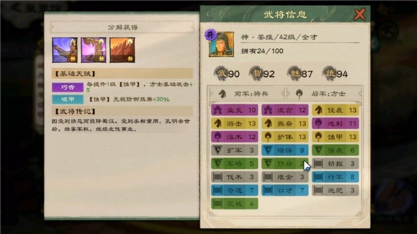 2、培养麾下武将,给他们研读古时名将留下的兵书提升作战能力,吸收技能碎片获得战斗技艺上的提升。