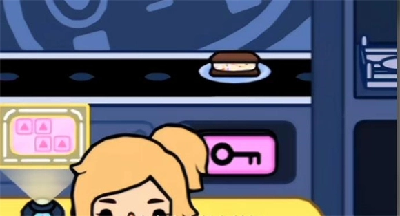 5、走进奶茶店,把两个盘子丢进垃圾桶,接着记住传送带上显示的密码,在旁边输入该密码,点击后出现粉色钥匙,这样就能去往一个新的区域。