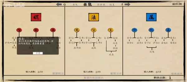 4、人物培养包括棍法、法力、属性三大方面,不断升级获取技能点变强。