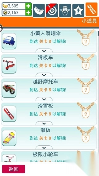 3、小工具在此分为防御和进攻两大类别。防御类小工具里,不仅有沙滩球、汽水这类对自身起到帮助作用的,还有曲奇机器人、臭屁枪这类用于骚扰追赶者的,甚至你还能借助喷气背包快速穿越重重障碍。进攻类小工具中,则包含火箭筒、火焰喷射器、果酱枪以及大型炸弹等不同等级的武器,能够将其他小黄人轰飞。在赛跑期间,你只要收集蓝色问号箱,就能激活防御小工具;而收集绿色问号箱,就可以激活进攻小工具。